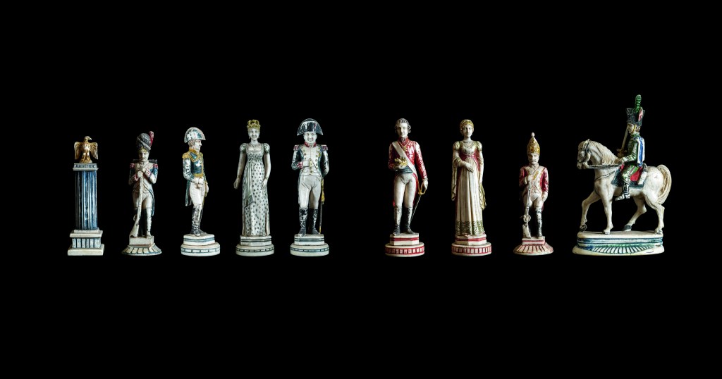 Da sinistra a destra l’aquila imperiale, un granatiere vecchia guardia, un maresciallo di Francia, imperatrice Maria Luisa e Napoleone Bonaparte. Quali antagonisti: l’imperatore Francesco d’Asburgo, l’imperatrice, un granatiere imperiale, un ussaro.