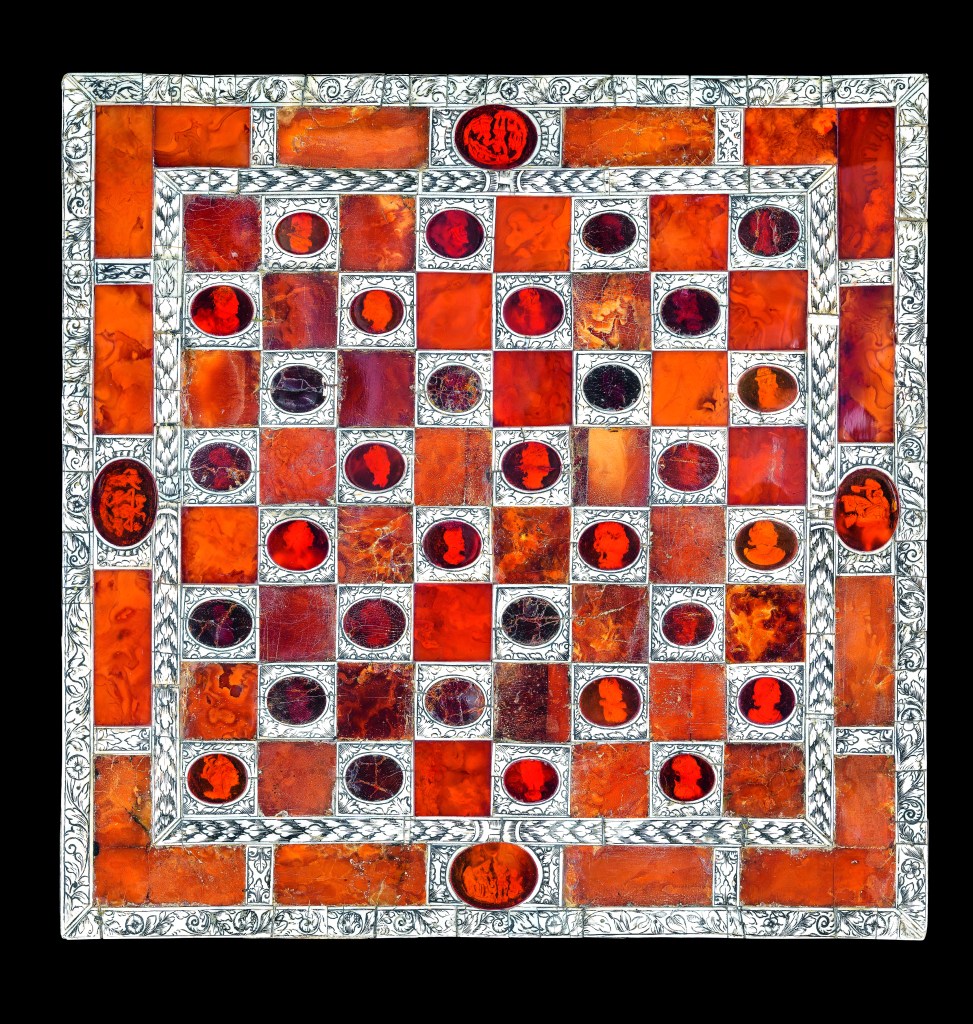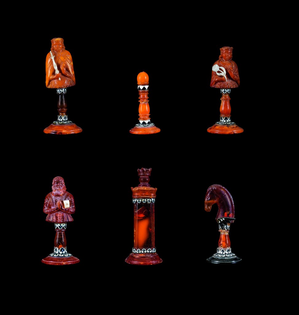 Fabbricata in Prussia, forse a Königsberg (oggi Kaliningrad) presso l’atelier di Georg Schreiber (c. 1600), questo eccezionale corredo da gioco in ambra ben rappresenta come sulle coste del Mar Baltico la resina fossile imperasse nei pezzi da Wunderkammer.